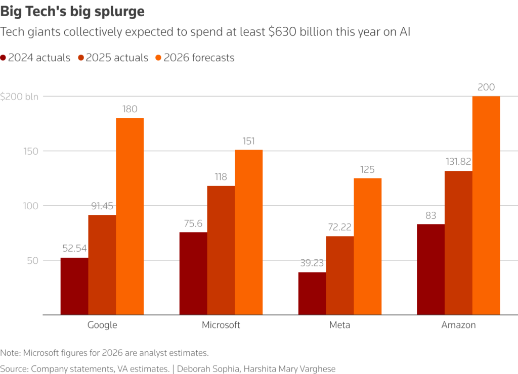 Big Tech giants are ramping up artificial intelligence investments, with Alphabet, Microsoft, Amazon and Meta expected to spend more than $630 billion combined this year, intensifying debate over whether returns will justify soaring valuations.