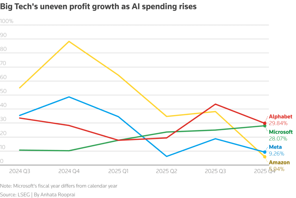 Amazon and Meta saw profit growth pressured by higher expenses tied to AI infrastructure. Meanwhile, Microsoft reported its strongest profit growth in two years, reflecting stronger cost control and enterprise demand.