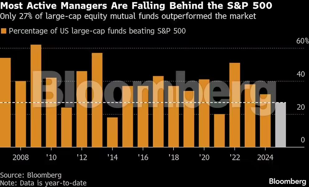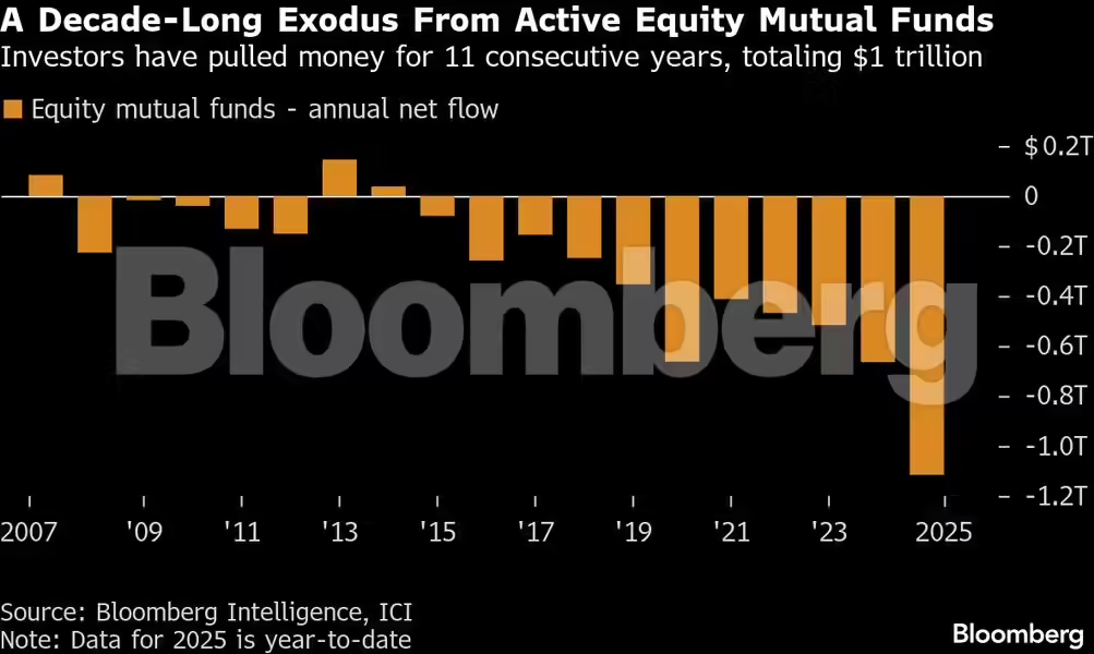 Investors pulled roughly $1 trillion from actively managed stock funds in 2025 as a handful of mega-cap tech companies dominated market returns making it harder for fund managers to outperform benchmarks and boosting passive investing.
