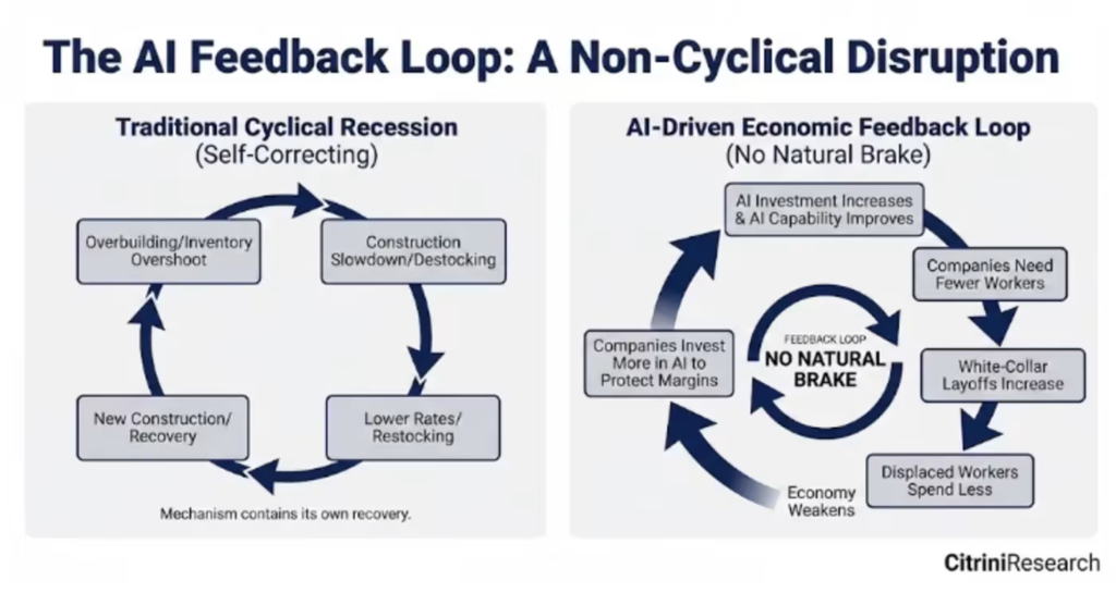 Citrini argues the dynamic becomes systemic because AI may differ from previous technological revolutions.