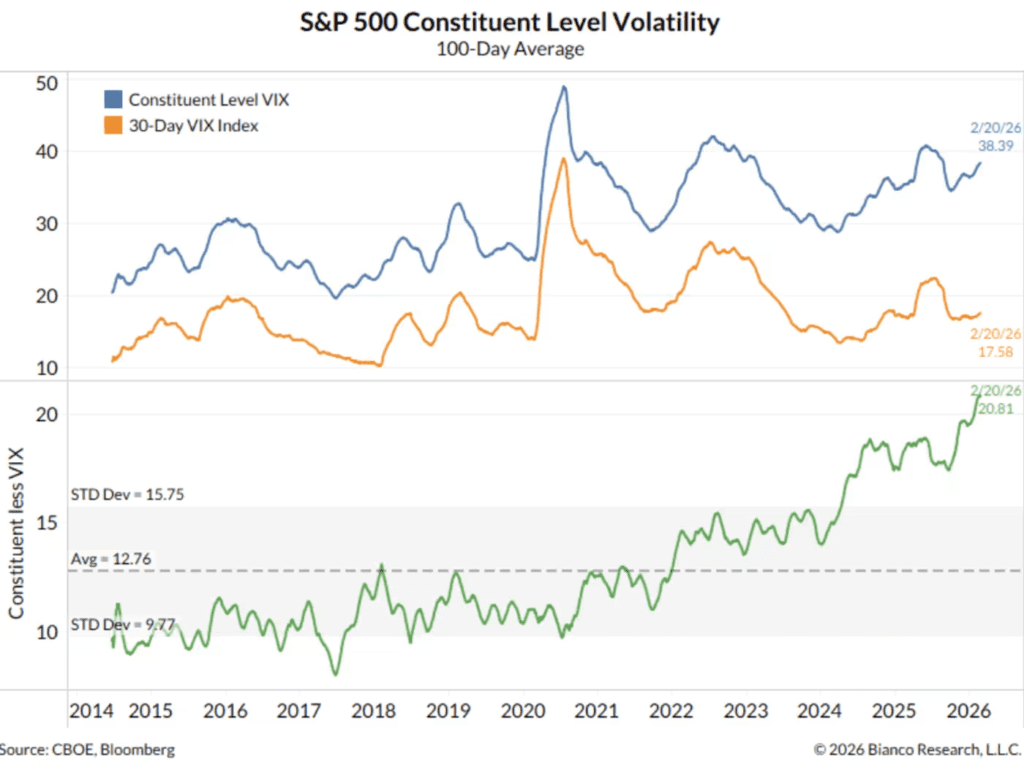 Yet volatility beneath the surface is rising. Individual stock volatility is widening sharply compared to the broader index, according to Bianco Research.