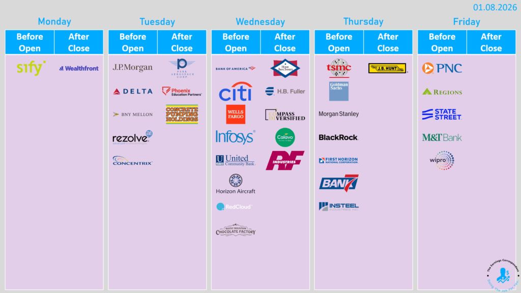 | Thursday | Initial jobless claims w/e Jan 10 208k prev • Continuing claims w/e Jan 3 1.91M prev • Import prices MoM Nov -0.2% exp • Empire State mfg Jan 1 exp (-3.9 prev) • Philly Fed outlook Jan -2.9 exp (-10.2 prev) | Taiwan Semiconductor Manufacturing Company (TSM) • Goldman Sachs (GS) • Morgan Stanley (MS) • BlackRock (BLK) • JB Hunt Transport Services (JBHT) • First Horizon Corporation (FHN) |