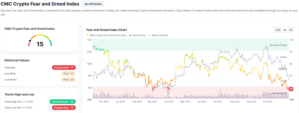 Bitcoin fell as much as 2–3%, extending the drop from its record high above $126,000 in early October. The move pushed the CoinMarketCap Crypto Fear & Greed Index to 15, its lowest reading since the 2022 bear market, signalling “extreme fear.”