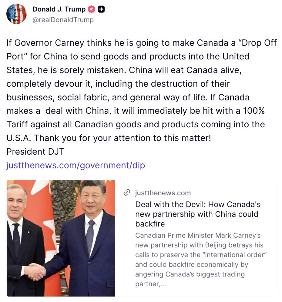 “If Governor Carney thinks he is going to make Canada a ‘drop-off port’ for China, he is sorely mistaken,” Trump wrote on Truth Social.