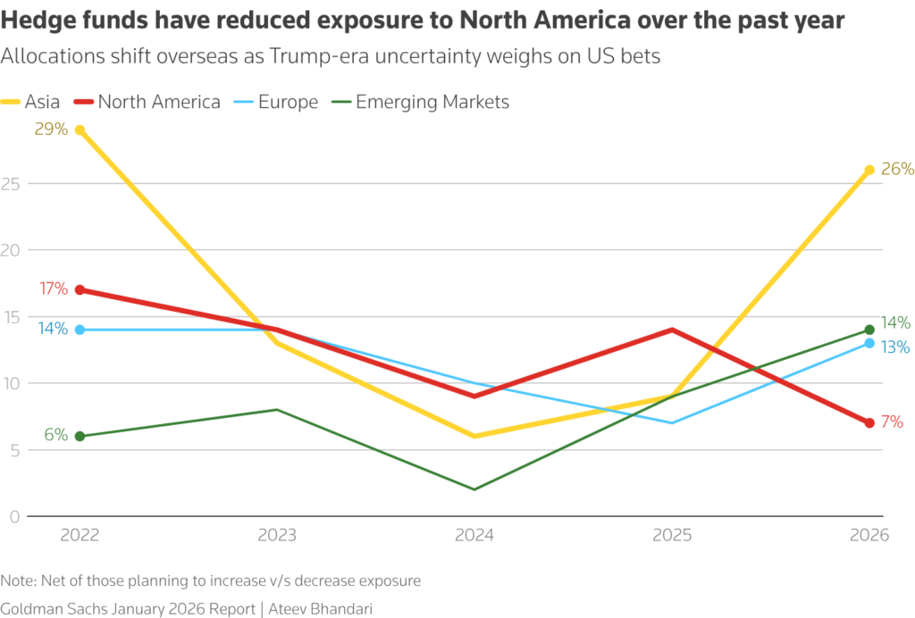 Portfolio managers are already responding. Janus Henderson has cut exposure to stocks and gold, moving toward a more neutral stance. At Ninety One, managers are using options to hedge against large swings in Treasury yields. Hedge funds, meanwhile, are reducing exposure to North American assets amid trade tensions and policy uncertainty.