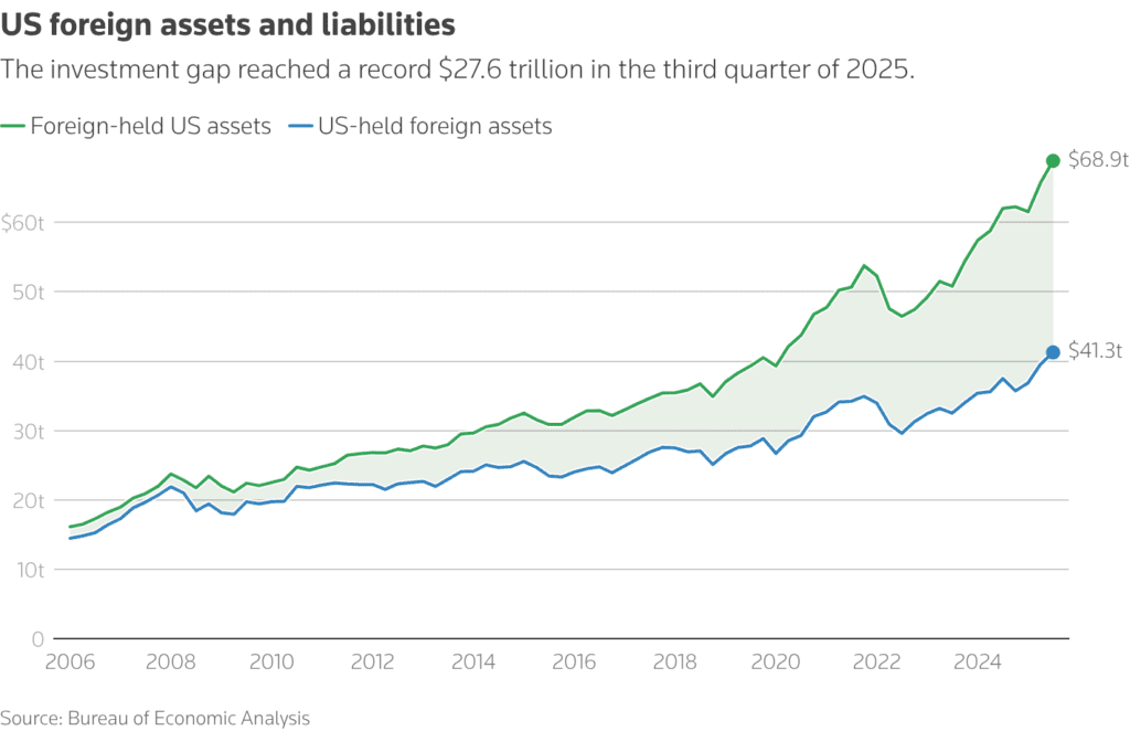 Foreign investors hold almost $70 trillion in US assets, more than double a decade ago. While a weaker dollar can normally support US equities and Treasuries, analysts warn that a disorderly decline could flip those relationships.