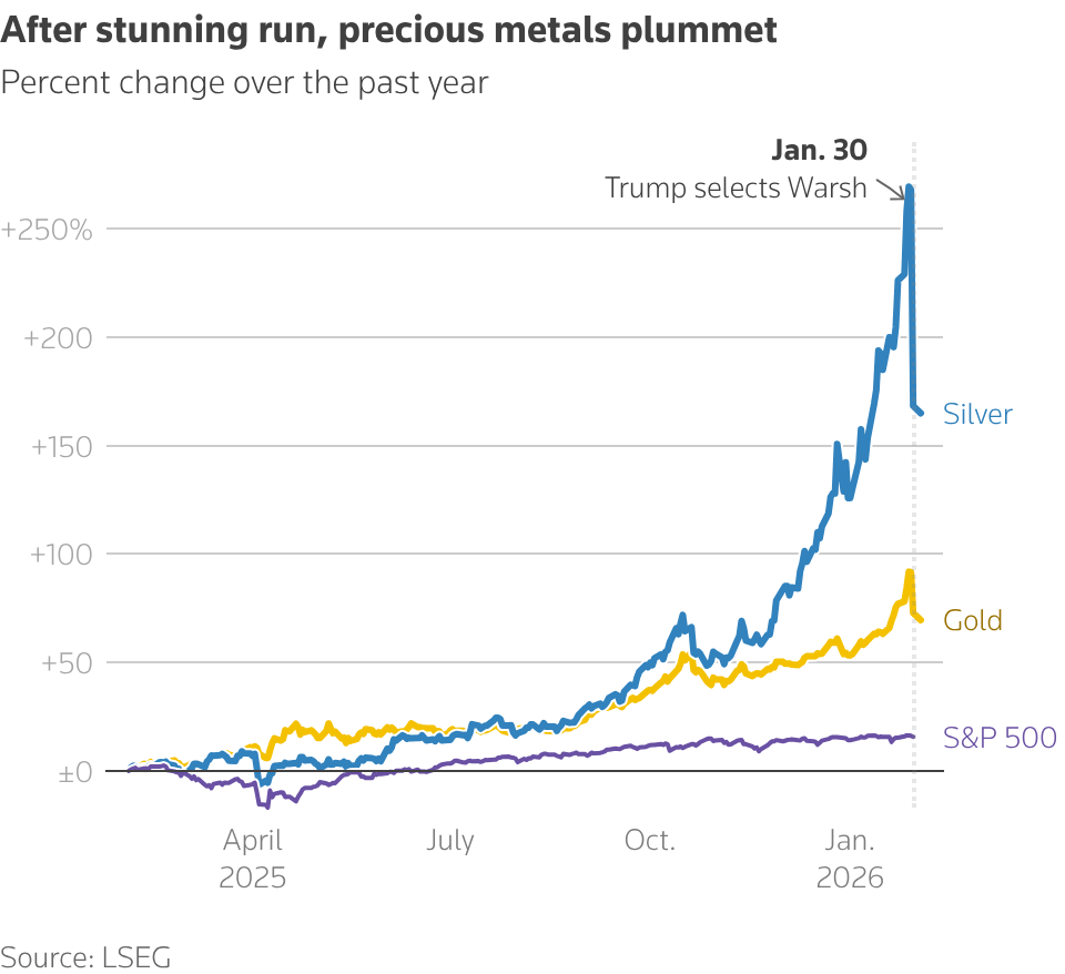 That shift upended the popular “currency debasement” trade. Gold, after its strongest January in more than 50 years, fell sharply, posting its biggest daily drop since the early 1980s before stabilizing. Silver and copper retreated from record highs, while oil headed for its worst weekly performance in nearly two months.