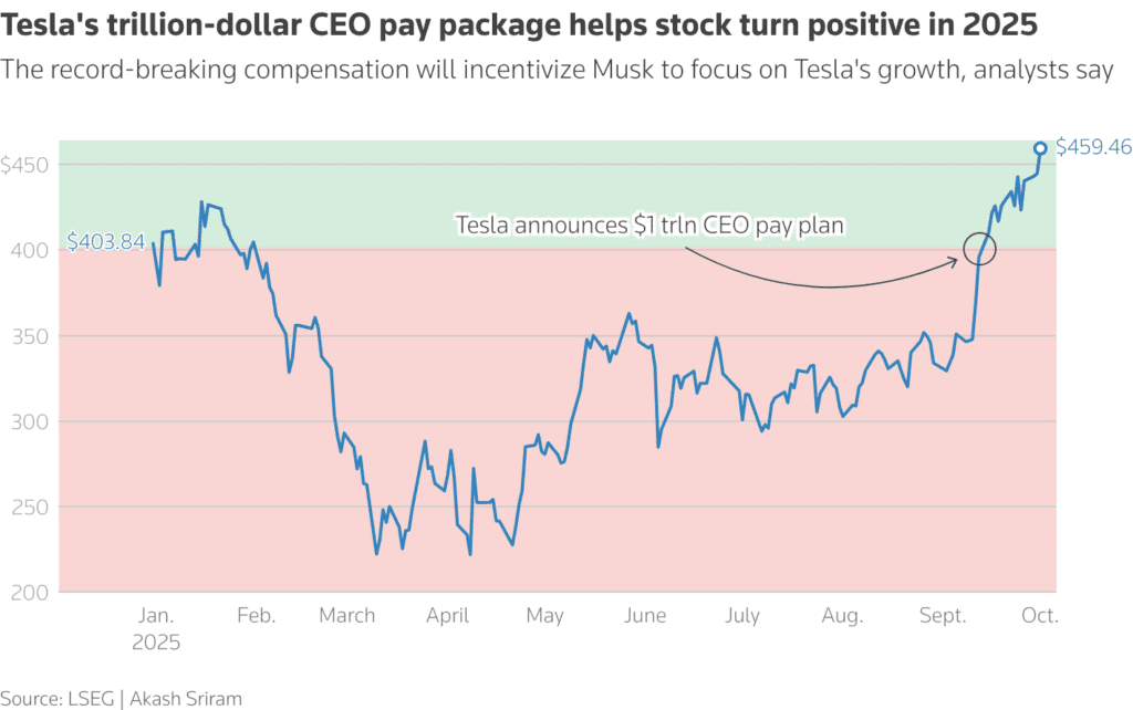 Adding fuel, Tesla’s board recently proposed a record $1 trillion pay package for Musk, the largest in corporate history. Since the announcement on September 5, Tesla shares have jumped 35.7%, as investors bet the package will cement Musk’s focus on the automaker’s ambitious growth.