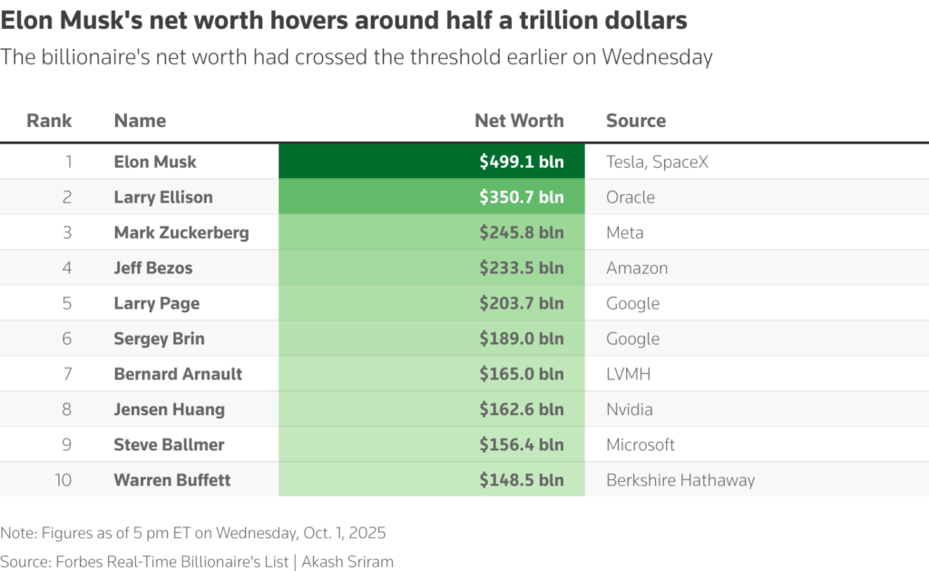 Musk’s wealth briefly hit $500 billion on Wednesday, before settling at $499.1 billion at market close, underscoring the volatility tied to his holdings. Still, he remains far ahead of his closest rival, Oracle founder Larry Ellison, whose net worth sits at $350.7 billion.