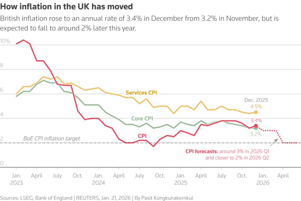 In the UK, inflation rose more than expected in December. While services inflation stayed in line with forecasts, the higher headline number suggests interest rates may stay high for longer.