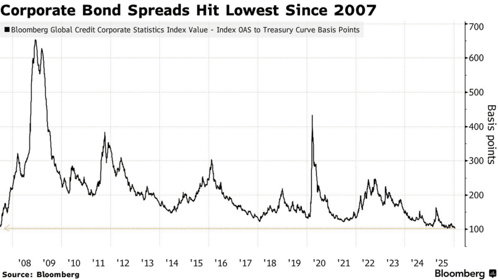 For now, demand and rate-cut hopes continue to support global credit markets. But with risk premiums near historic lows, investors face a narrowing margin for error.