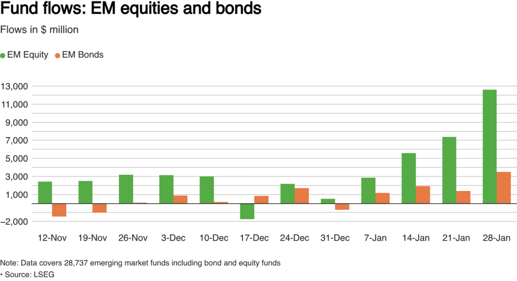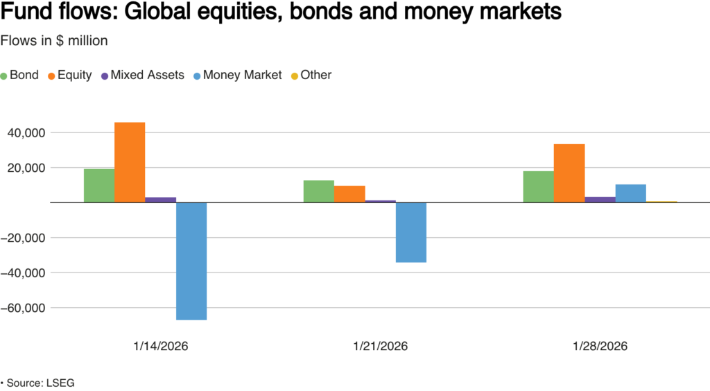 According to data from Reuters, global equity funds recorded $33.39 billion in net inflows in the week ending January 28. That marked a sharp jump from roughly $9.5 billion in inflows the previous week, based on figures from LSEG Lipper.