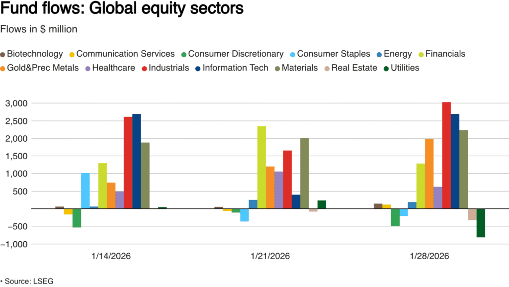 Investor appetite was strongest in cyclical and growth-oriented sectors. Industrial funds saw $3.04 billion in inflows, technology funds added $2.7 billion, and metals and mining funds drew $2.24 billion, reflecting optimism around global growth and commodity demand.