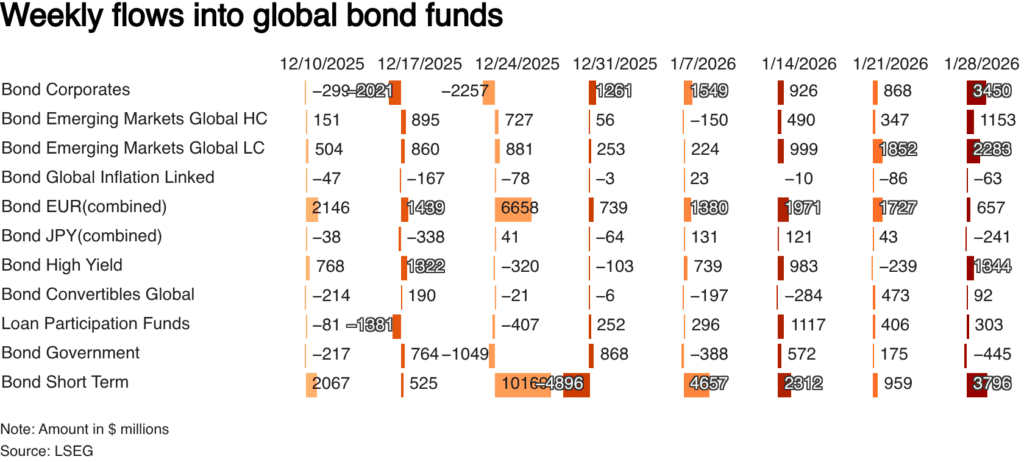 Emerging markets stood out as well. Emerging market equity funds pulled in $12.63 billion, the biggest weekly inflow since at least 2022, supported by cheaper valuations and stronger growth expectations. EM bond funds also saw healthy demand, with $3.51 billion in net inflows.