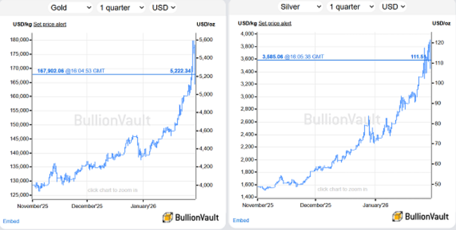 Gold and silver prices fell hard on Thursday after hitting fresh record highs, as a sharp selloff in US tech stocks rattled markets and triggered a rush out of so-called safe havens.