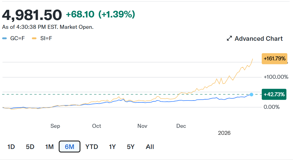 On Friday, gold surged toward $5,000 an ounce, while silver broke above $100 for the first time in history, marking a historic moment for the precious-metals market and capping gold’s best weekly performance since 2020.