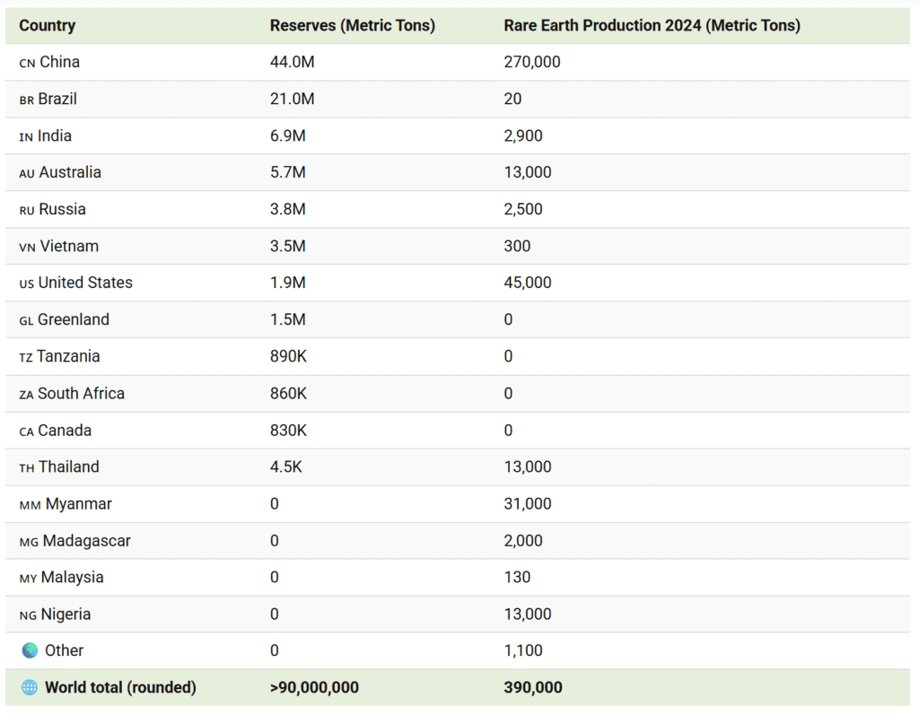 According to the US Geological Survey, China remains the undisputed leader in rare earth supply. In 2024, it produced 270,000 metric tons, accounting for well over half of global output, and controls reserves of about 44 million metric tons, by far the world’s largest.