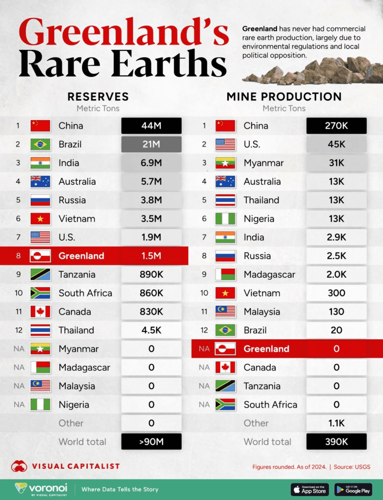 Greenland now ranks among the more significant reserve holders, ahead of Canada and South Africa, yet remains entirely undeveloped.