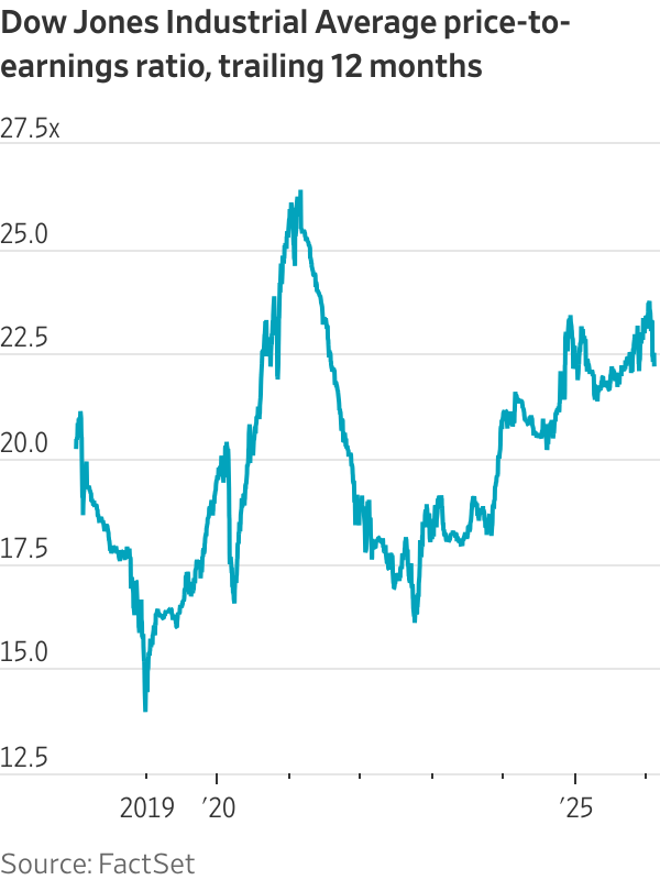 Strong earnings growth laid the foundation for the rally, but higher valuations are now playing a bigger role. Investors are paying about 22 times trailing earnings for the Dow’s 30 companies, up from roughly 20 times at the 25,000 mark in 2018. Valuations climbed even higher in 2021, when ultralow interest rates left investors with few alternatives to stocks.
