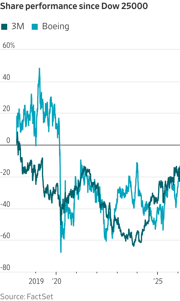 • Salesforce has been the largest laggard since 25,000. Shares have fallen sharply over the past year amid concerns that AI could disrupt its core business.
