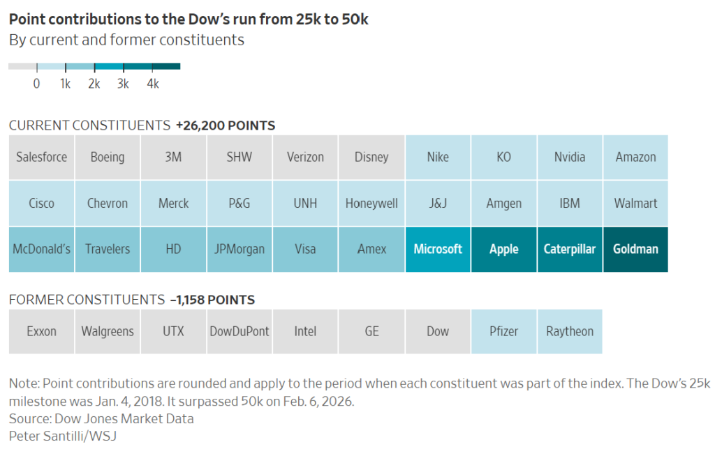 It took just over eight years for the blue-chip index to climb from 25,000 to 50,000, a sharp contrast to the more than 100 years it took to reach 25,000 in 2018. Because the Dow is price-weighted, stocks with higher share prices have outsized influence on its moves, regardless of market value.