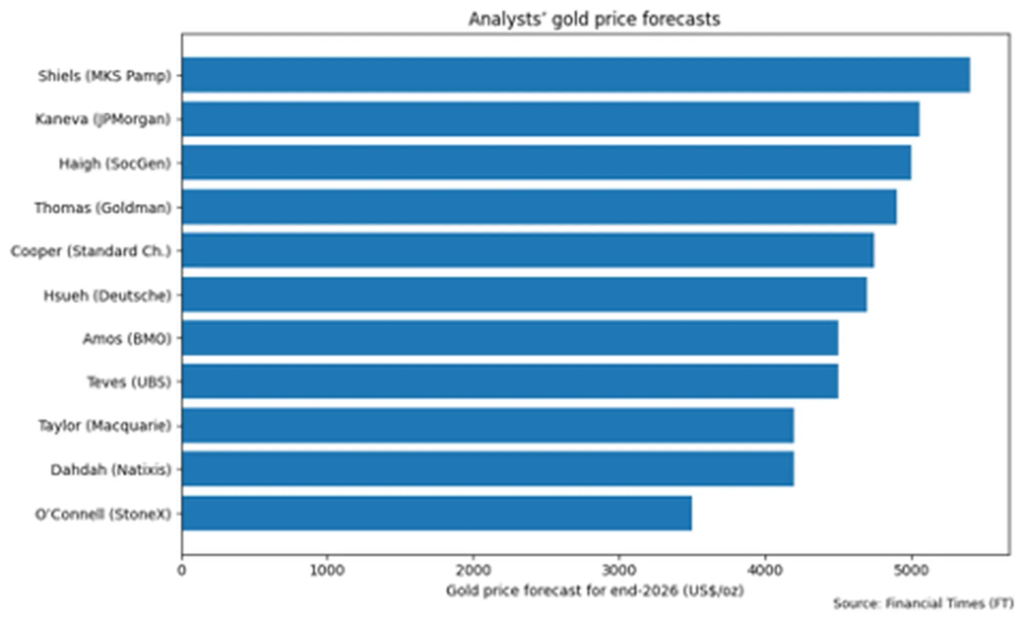 That caution shows up clearly in forecasts. A recent Financial Times survey of strategists put the average 2026 year-end gold target at $4,600, well below current levels. Macquarie’s Peter Taylor went further, warning that gold’s path is now being shaped as much by speculation as fundamentals, with prices potentially slipping toward $4,200 by late 2026.