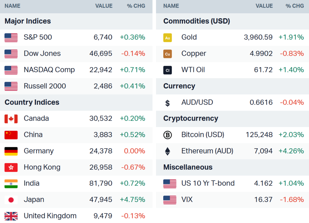 Global equities extended their record-setting rally Monday, powered by AI optimism and strong risk sentiment despite political headwinds in the US, France, and Japan. Gold hovered near the $4,000/oz mark as investors hedged against fiscal and geopolitical uncertainty.
