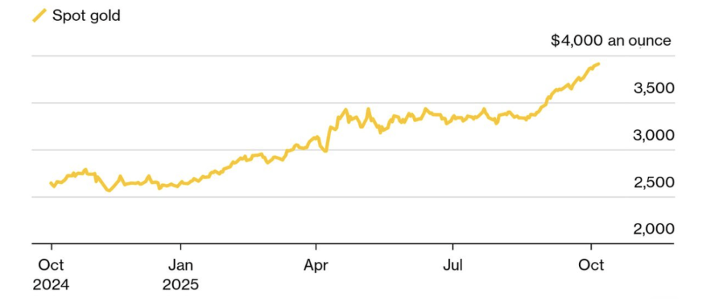 Gold +0.4% in Asia, printing fresh records around $3,970–3,980/oz, within sight of $4,000, supported by: