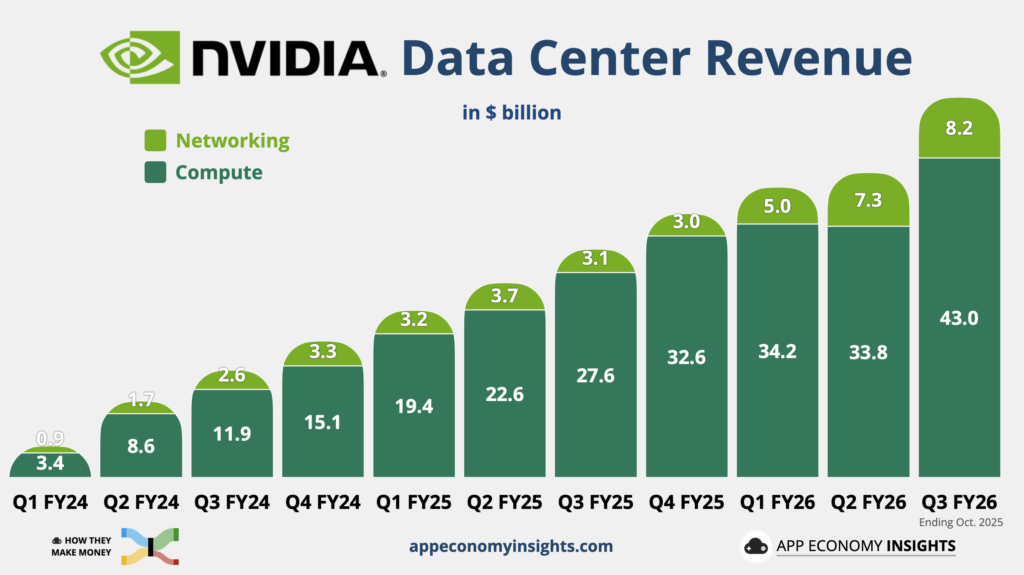 • Data center revenue: 51.2 billion dollars, up roughly two thirds from a year ago and about one quarter from Q2, beating every major Wall Street forecast.