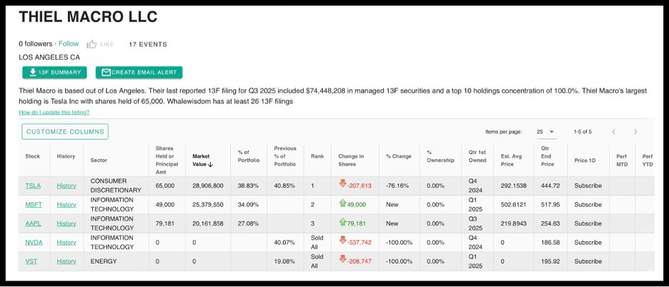 Thiel’s decision is striking not only because he sold out entirely, but because his fund’s entire US equity book shrank from $212 million to just $74 million in the same period. This is not a trim, it’s a decisive retreat from one of the world’s most dominant AI companies at the height of its power.