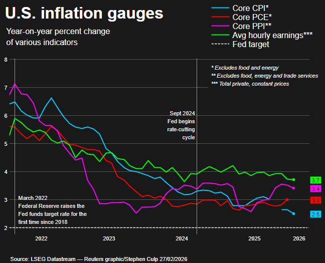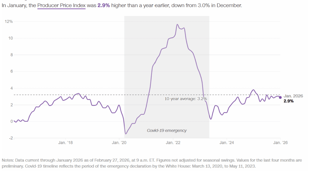 US stocks fell sharply on Friday after January’s producer price index (PPI) came in hotter than forecasts, adding fresh uncertainty for investors already concerned about AI disruption and private credit stress.