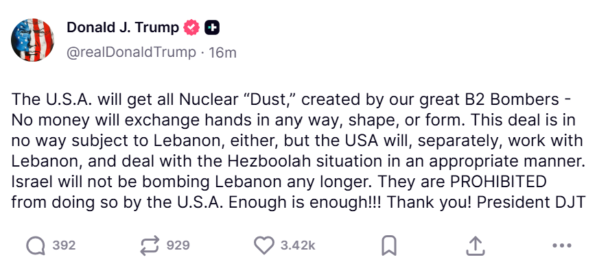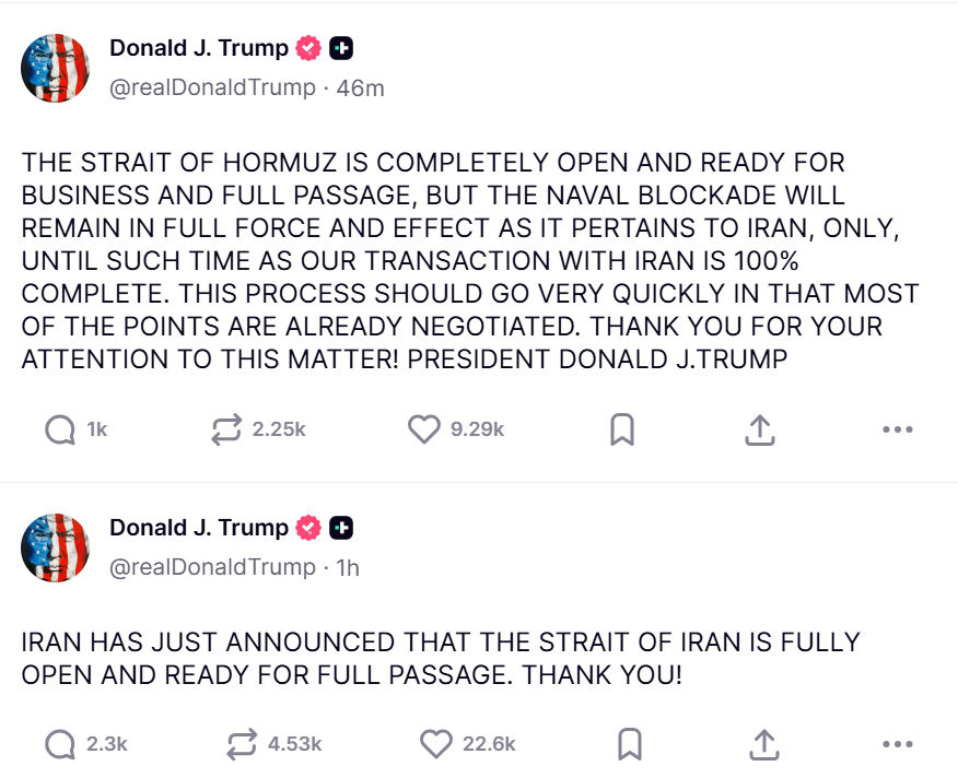 “IRAN HAS JUST ANNOUNCED THAT THE STRAIT… IS FULLY OPEN AND READY FOR FULL PASSAGE. THANK YOU!”