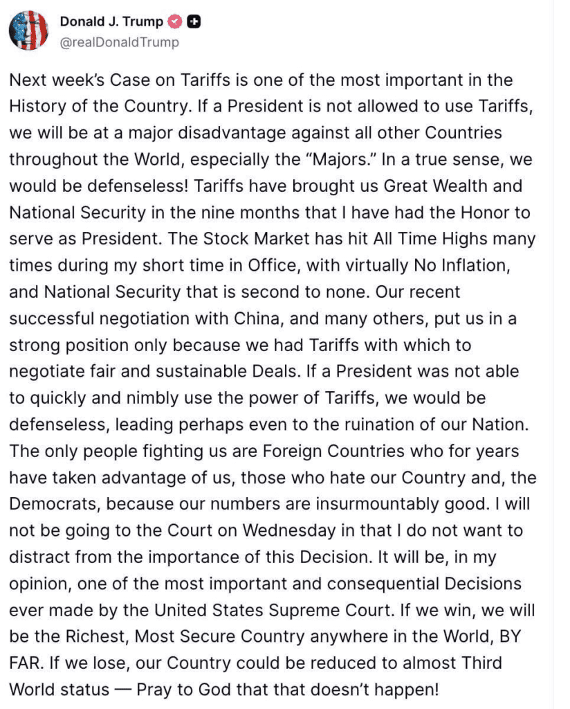 The US Supreme Court will this week hear one of the most consequential economic cases in decades, a challenge to President Donald Trump’s sweeping use of emergency powers to impose global tariffs. Trump has called the case “one of the most important in the history of the country,” warning that if the Court limits his authority, the US could be “reduced to almost Third World status.”