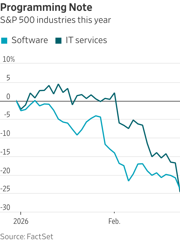 Companies are pouring billions into AI data centres, chips, and research. Yet shares of firms that could be disrupted by AI, particularly software and services companies, have dropped sharply. The S&P 500 software and services sector has been under heavy pressure this year.