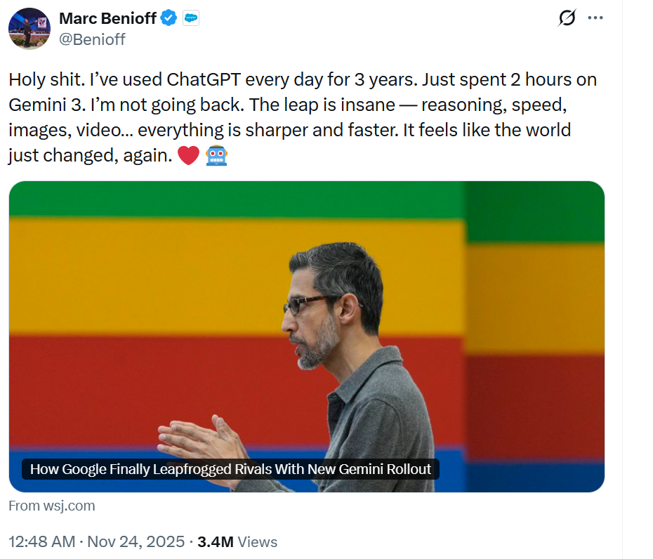 The excitement followed Salesforce CEO Marc Benioff’s viral post claiming Gemini 3 is so advanced that “it feels like the world just changed again.” And it might have. Shares of Alphabet (NASDAQ: GOOGL) jumped nearly 8% last week, while Nvidia slipped more than 2%, showing that investors are taking Google’s rise seriously.