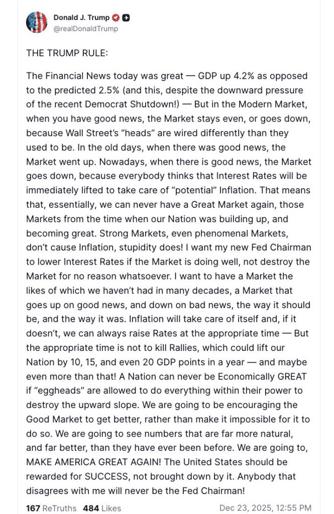 In a social media post on Tuesday, Trump said he wants a Fed chair who cuts rates if the market is doing well, arguing that strong economic data should no longer trigger fears of tighter monetary policy. He added that anyone who disagrees with this view “will never be the Fed Chairman.”