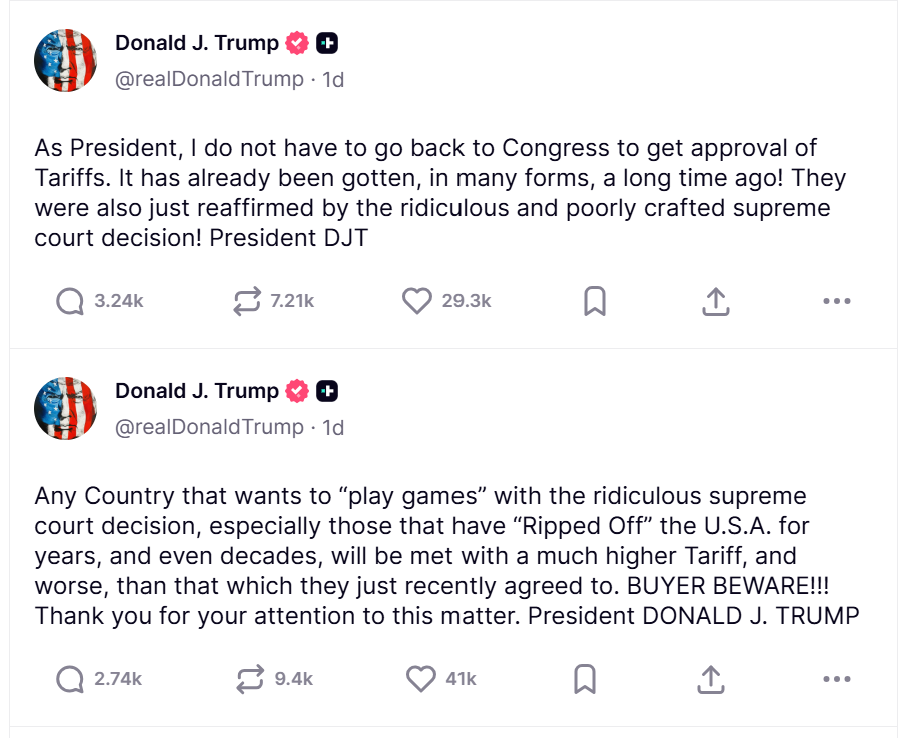“Any Country that wants to ‘play games’ with the ridiculous Supreme Court decision… will be met with a much higher Tariff, and worse, than that which they just recently agreed to. BUYER BEWARE!!!”