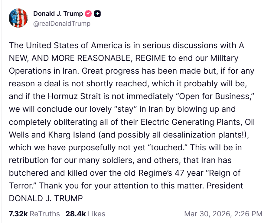 “Great progress has been made,” Trump said, but quickly added that if negotiations fail and the Strait of Hormuz is not reopened, the US would respond by “blowing up and completely obliterating” Iran’s oil wells, power plants, and Kharg Island, the country’s most critical export hub.