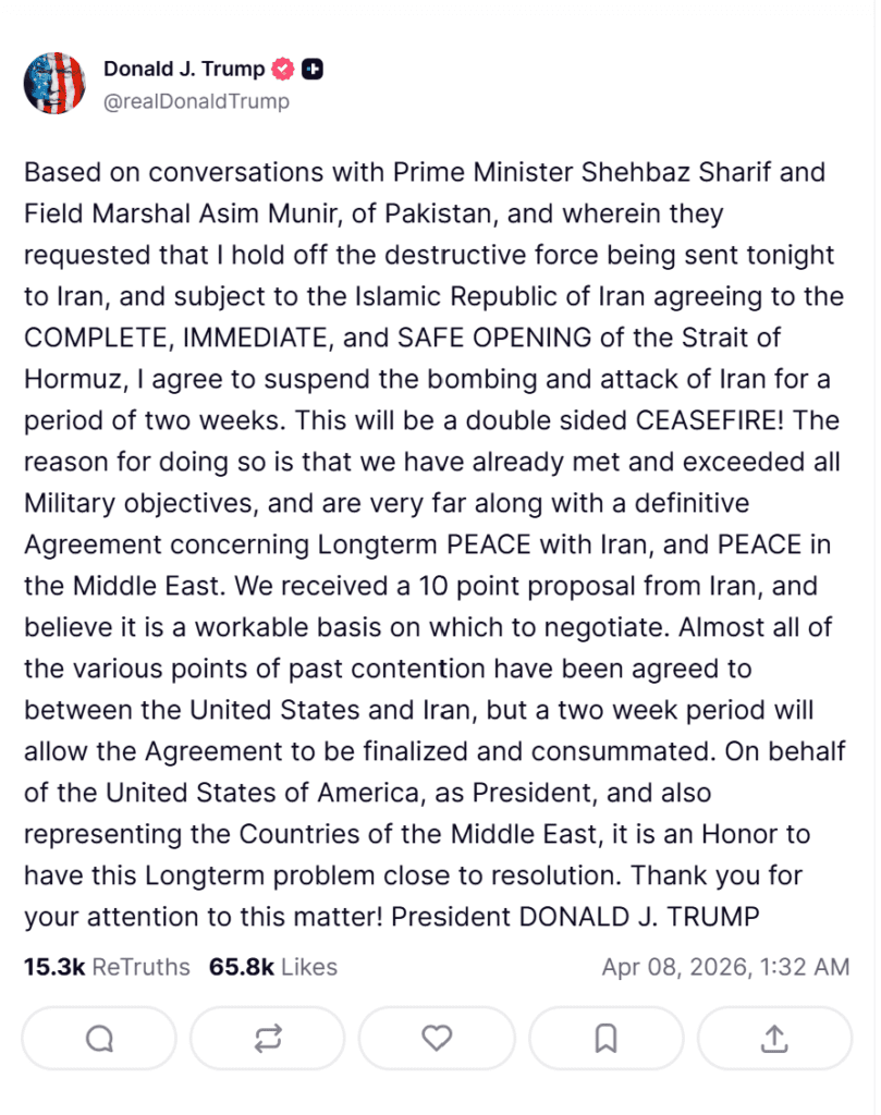President Donald Trump’s sudden announcement of a two-week ceasefire with Iran has offered the world a temporary sense of relief after weeks of escalating conflict. The agreement, tied directly to Iran reopening the Strait of Hormuz, immediately shifted both geopolitical tension and financial markets.
