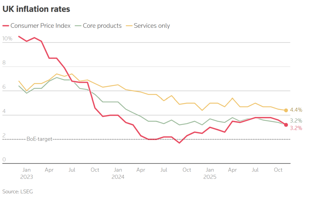 Official data showed consumer price inflation dropped to 3.2%, down from 3.6% in October, marking its lowest level since March. The reading came in below all economists forecasts and undershot the Bank of England’s own projections.