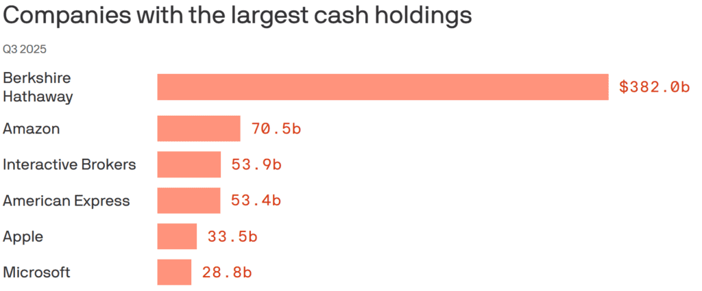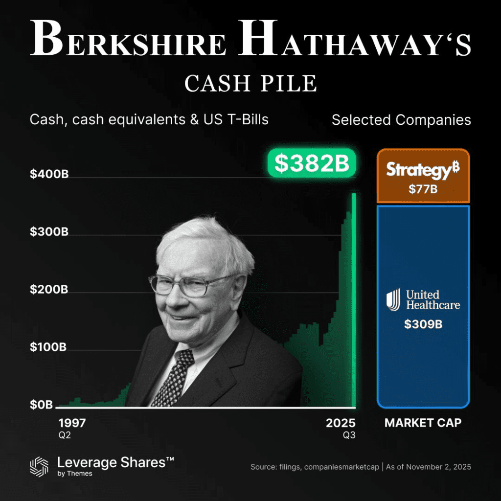 Warren Buffett’s Berkshire Hathaway has amassed a record $382 billion in cash, more than the combined reserves of Apple, Microsoft, and Alphabet, giving incoming CEO Greg Abel unprecedented financial firepower when he takes over in 2026.